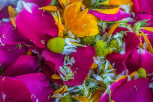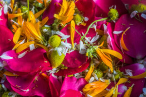 Am besten erntet man die frischen Blüten vormittags, wenn der Morgentau bereits getrocknet ist. Die Blüten werden anschließend handverlesen, aber nicht gewaschen, da man dabei nicht nur Wirkstoffe und Aroma wegspülen würde, sondern auch zusätzliche Feuchtigkeit in den Ansatz bringen würde. Anschließend werden die Blüten handverlesen und für 1 bis 2 Tage an einem schattigen, luftigen Ort etwas angetrocknet. Größere Blütenköpfe, wie zum Beispiel die der Ringelblume werden zerteilt. Von den Rosen werden ohnehin nur die Blütenblätter verwendet. Der Griffel bleibt hier an der Pflanze für die Bienen.