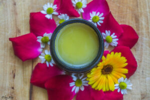 Für mein Blüten-Pflegeöl habe ich die Blüten von Rosen, Kamillen und Ringelblumen gewählt. Grundsätzlich kann man jede Rosensorte verwenden, sofern sie nicht in irgendeiner Weise chemisch behandelt ist. Bevorzugt sind natürlich Duftrosensorten oder auch wilde Sorten wie die Hundsrose, die Kartoffelrose oder auch die Apothekerrose. Rosenblütenblätter gehören zu den traditionellen pflanzlichen Arzneimitteln. Aufgrund ihrer entzündungshemmenden und adstringierenden Eigenschaften werden sie äußerlich bei leichten Hautentzündungen sowie bei Entzündungen im Mund und Rachenraum verwendet.