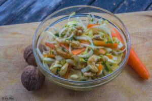 Der Chicoree, die Karotte und der Apfel werden in feine Streifen bzw. Blätter geschnitten. Der Apfel muss dazu nicht geschält werden, da vor allem in der Schale viele wertvolle Inhaltsstoffe enthalten sind. Allerdings achten wir bei unseren Zutaten immer auf die Bio-Qualität. Frische Korianderblätter werden fein gehackt und mit den anderen Zutaten vermengt. Die Walnusskerne, und oder Cashewkerne werden grob gehackt und der Salatmischung beigegeben.